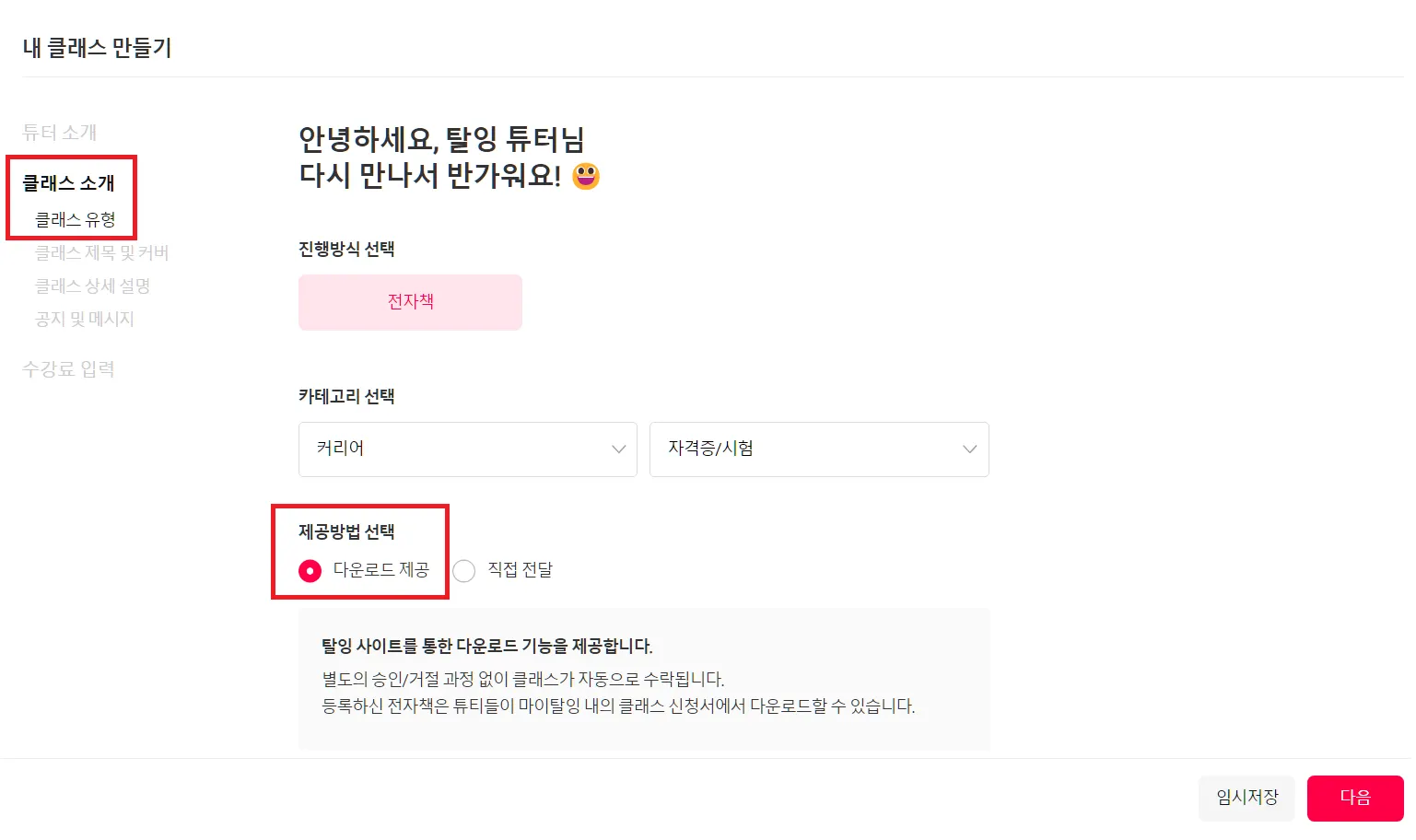 거창하게 말씀드렸지만 사실 간단합니다. 클래스 유형에서 제공 방법을 다운로드 제공으로 선택하시면 돼요!
