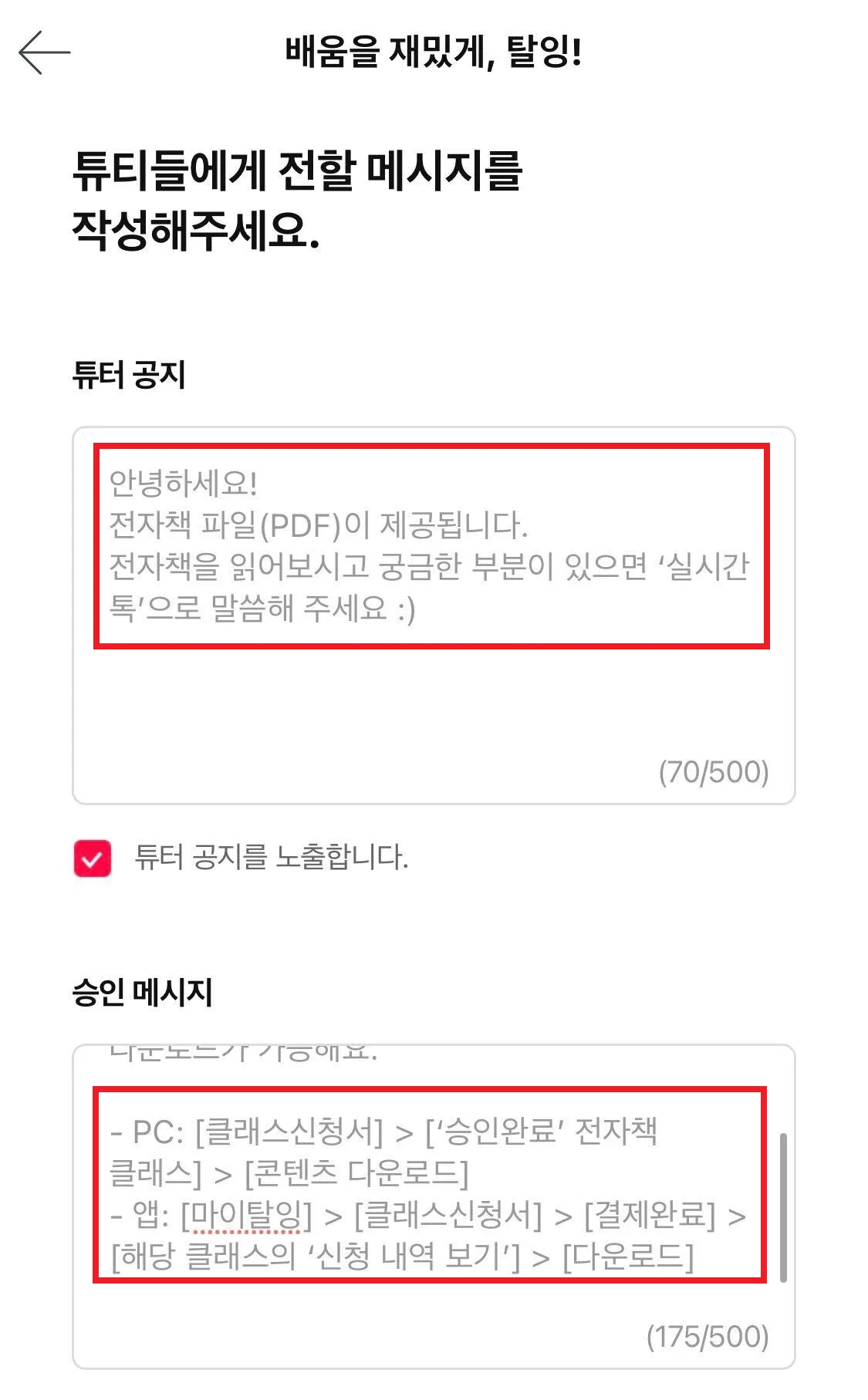 기존의 직접 전달 방식은 튜터님과 수강생님이 서로 소통한 다음 전자책을 발송했지만, 다운로드 방식은 구매 후 수강생이 바로 전자책을 다운로드 받을 수 있어요!