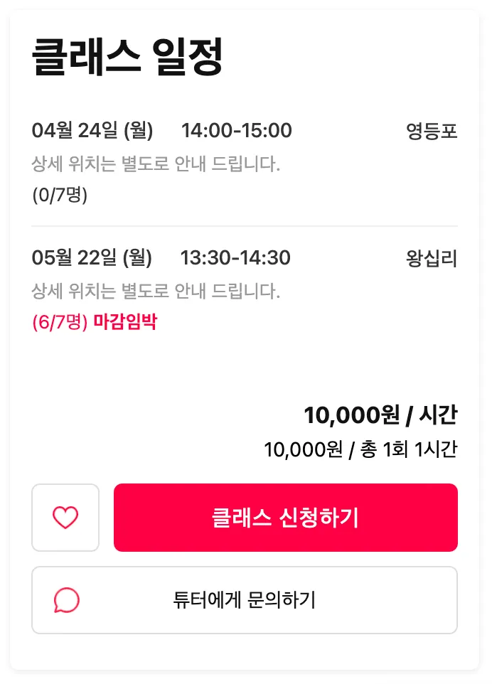 튜터님이 설정한 클래스 최대 참여인원 중 현재 몇 명이 참여 중인지를 수강생이 바로 확인할 수 있습니다.