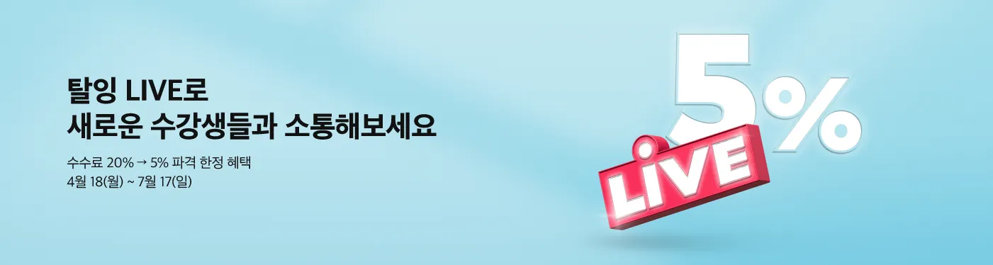 아직 탈잉 LIVE를 이용해 보지 않으셨다면 5% 수수료 할인 혜택과 함께 지금 바로 시작해 보세요!