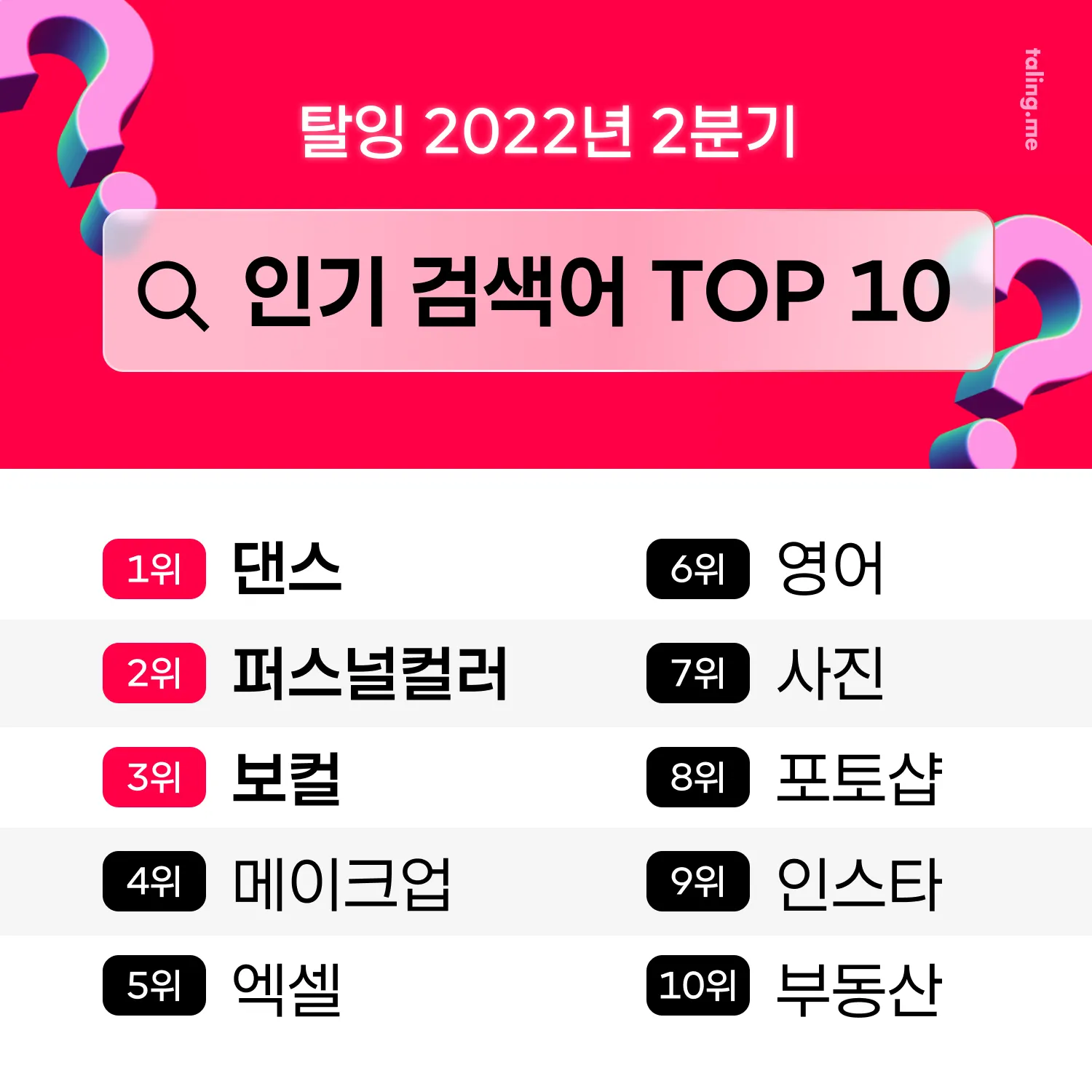 전자책이 빠른 성장으로 이목을 끌었다면, 올해 2분기 탈잉에서 주목받았던 인기 검색어 는 무엇인지 살펴볼까요?