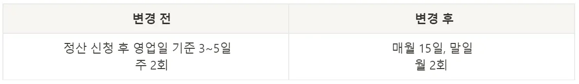 지난 7월 18일 수수료 개편과 정산 시스템 개선 작업이 진행됨에 따라 정산 주기가 월 2회로 변경될 예정입니다.