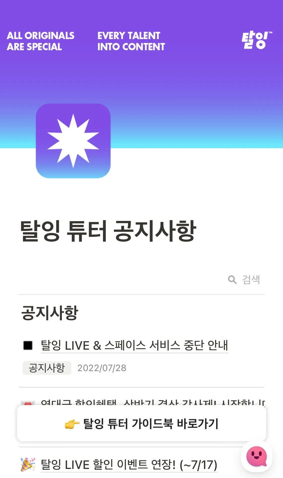 2022년 8월 3일부터 탈잉 LIVE와 스페이스 서비스가 잠정적으로 중단됩니다.