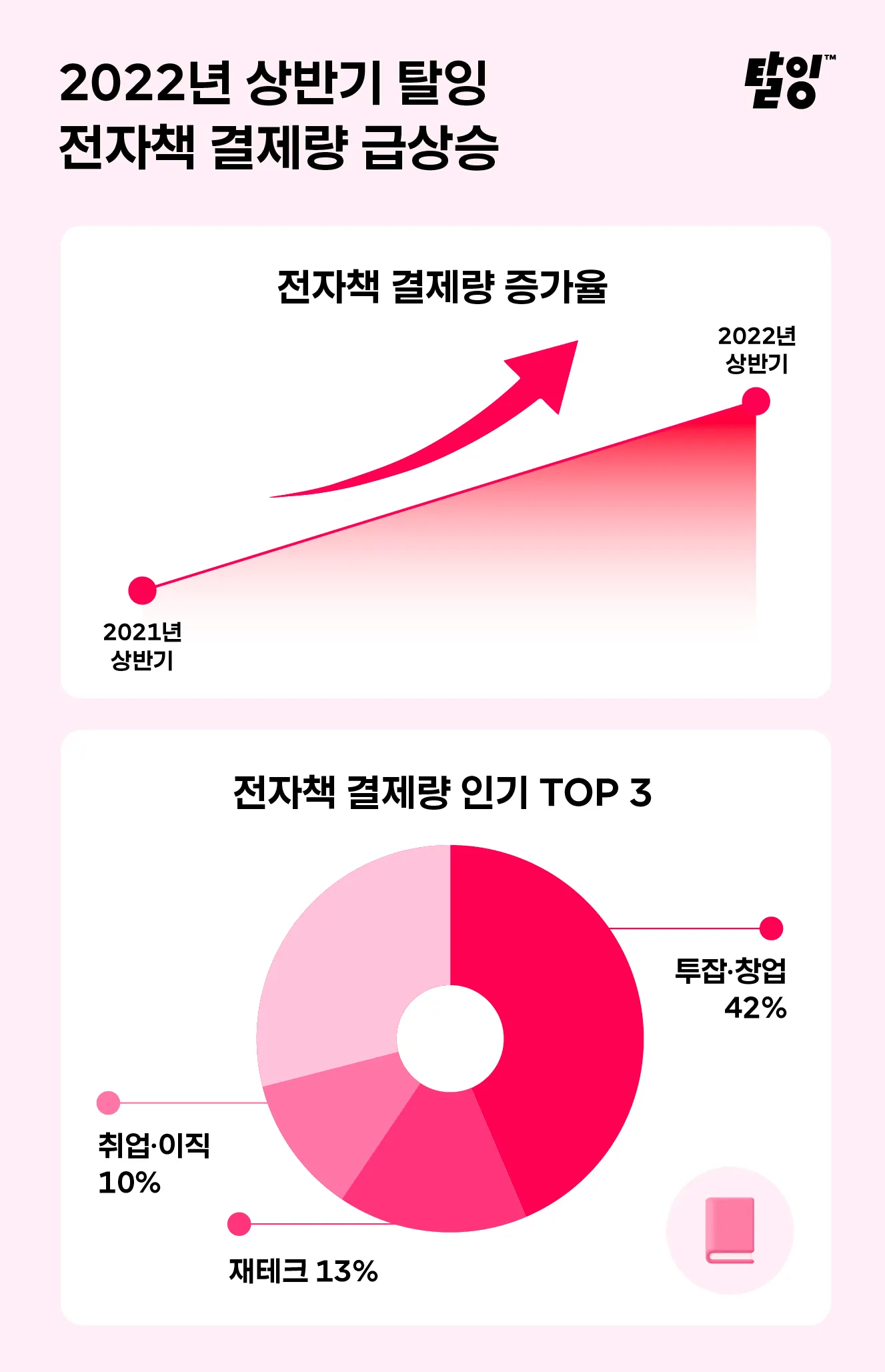 조금 더 자세히 살펴보면 투잡·창업(42%), 재테크(13%), 취업·이직(10%) 카테고리가 전자책 중 높은 비중을 차지한다는 것을 알 수 있습니다.
