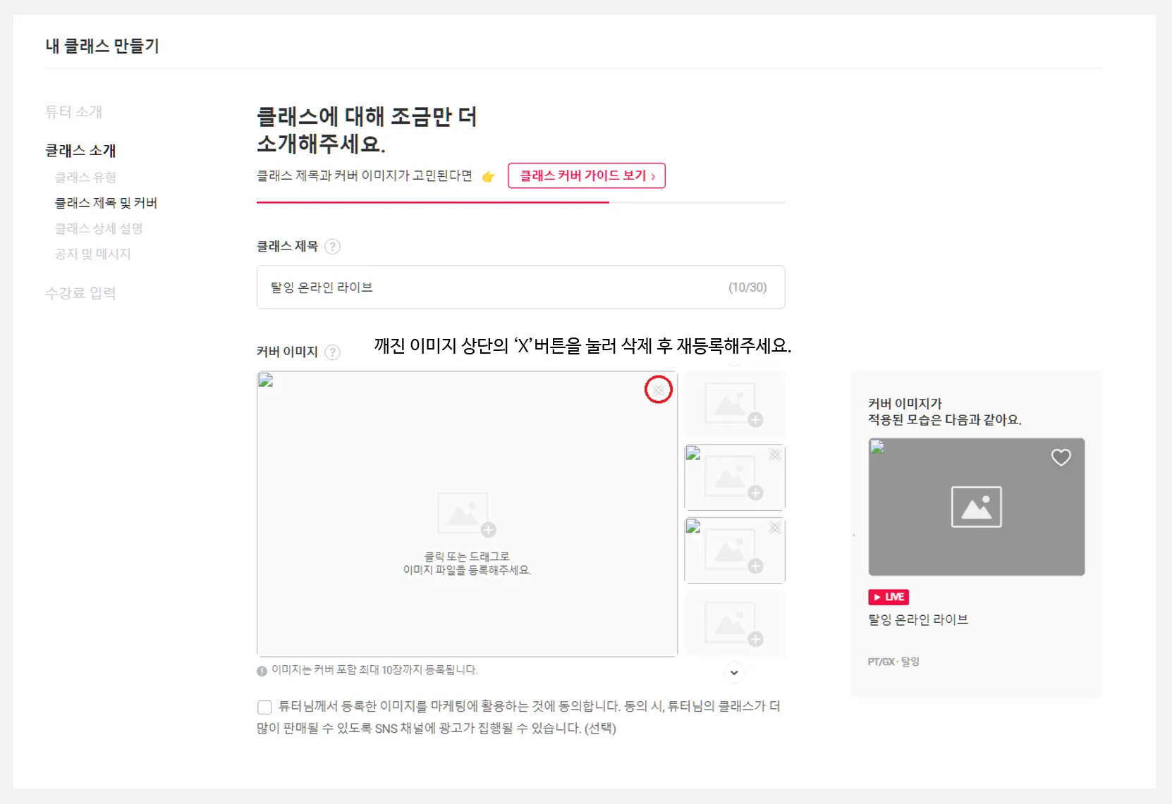‘클래스 제목 및 커버’ 메뉴로 이동 시 이전에 등록하신 이미지가 깨진 상태로 보이는 것을 확인하실 수 있습니다.