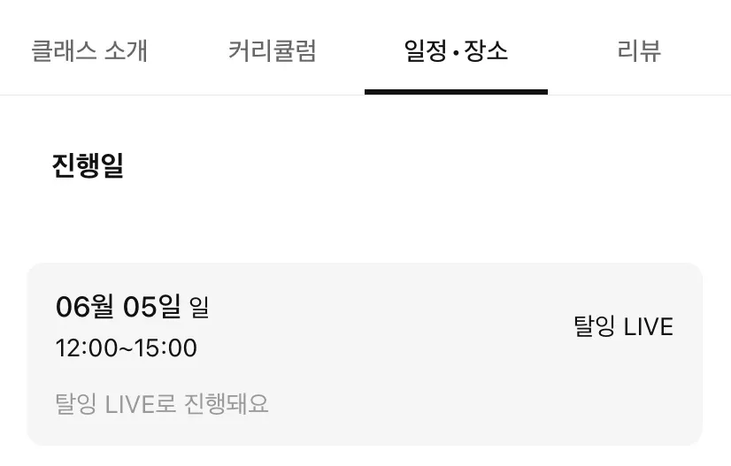 클래스 썸네일 ‘탈잉 LIVE’ 뱃지와 함께 클래스 일정에서도 ‘탈잉 LIVE로 진행돼요’라는 안내 문구가 추가되었어요!