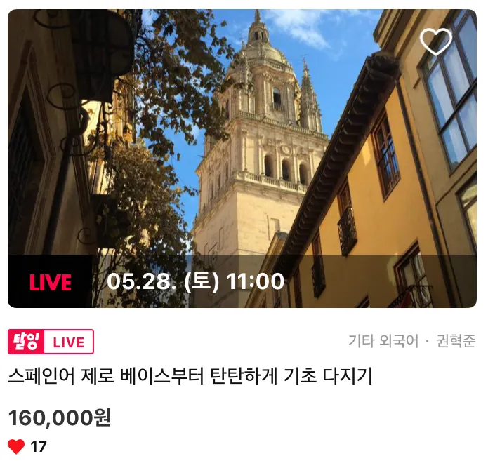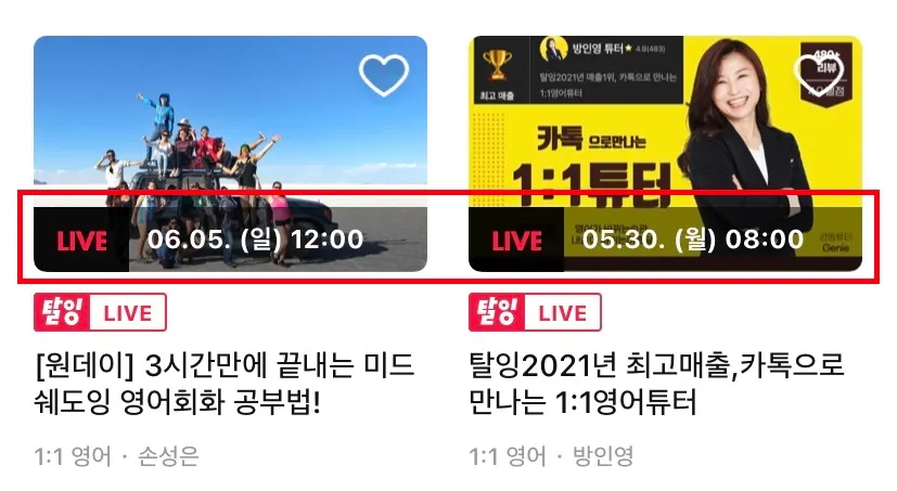 탈잉 LIVE로 진행되는 클래스의 경우 썸네일 하단에 현재로부터 가장 가까운 라이브 일정이 표기되게 되었어요!